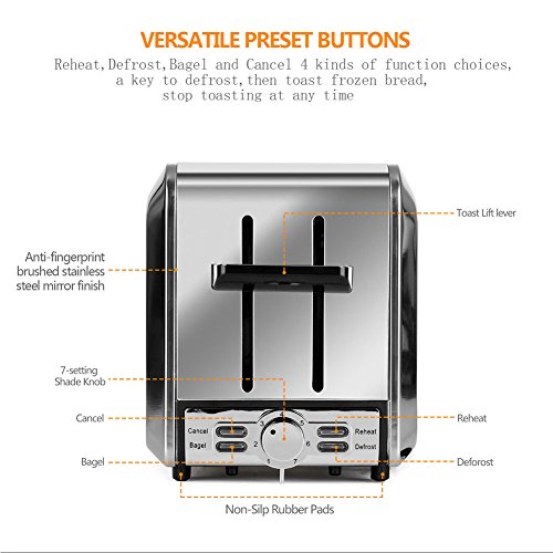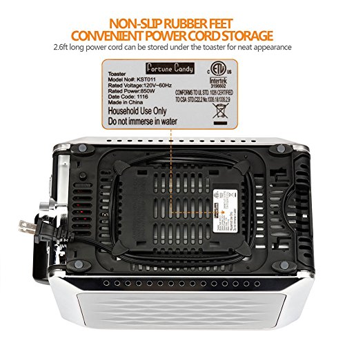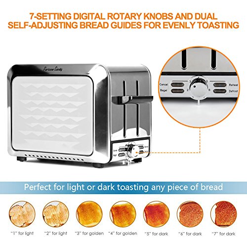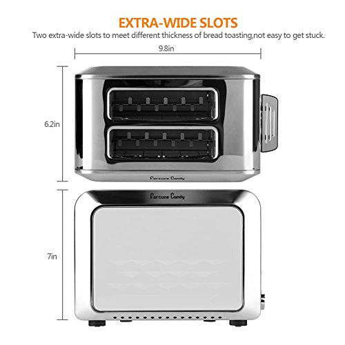 ★★Product Features High-Quality Craft and Stylish Appearance Beautifully housed in brushed stainless steel with attractive white accents, this 2-slice toaster from Fortune Candy looks great in today's kitchen. 7 Adjustable Digital Rotary Knobs Use the following settings for: Settings 1-2: light shade of toast; Settings 3-4: medium shade of toast; Settings 5-7: dark shade of toast. 4 Different Toasting Functions Defrost, Bagel, Reheat and Cancel buttons with blue backlit LED indicators. Advanced electronic toasting technology and toasting temperature control ensure for quickly and evenly toasting results. Extra-Wide Toasting Slots 1-1/2-Inch wide 2-slice toasting slots allow you to toast breads, bagels and english muffins with this compact stainless steel 2-slice toaster, not easy to get stuck. High-Lift Lever Never burn yourself when removing toasts from this toaster with the toast lift lever. Removable Crumb Tray Slide out the crumb tray with a gently press to remove crumbs. Convenient Power Cord Wraps Use the cord storage cleats under this red 2-slice toaster to store 2.6 feet long power cord for neat appearance while not in use. ★★Product Specifications Size: 11.1*6.2*7 Inches Power: 120V 850W 60HZ Capacity: 2 Slices Material: Stainless Steel and Eco-friendly PP Plastic Design Style: Simple, Stylish and Elegant Process Technology: Brushed Stainless Steel Polished Finish with Stylish Attractive Diamond Pattern ★★Package Includes 1*Fortune Candy White Stainless Steel 2-Slice Toaster 1*User Manual ★★Warranty 3 Year Warrantys for All Fortune Candy Stainless Steel 2-Slice Toasters. 0