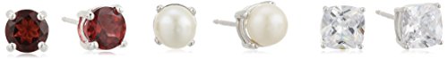 Sterling Silver Round Genuine Garnet 6mm, Genuine White Freshwater Pearl 5.5-6mm and Cushion-Cut Cubic Zirconia 6mm Three Stud Earrings Jewelry Set