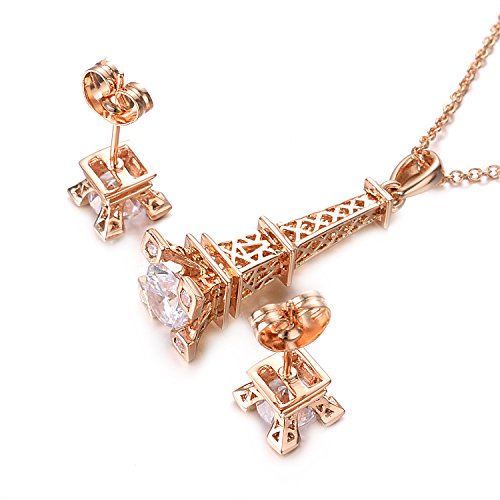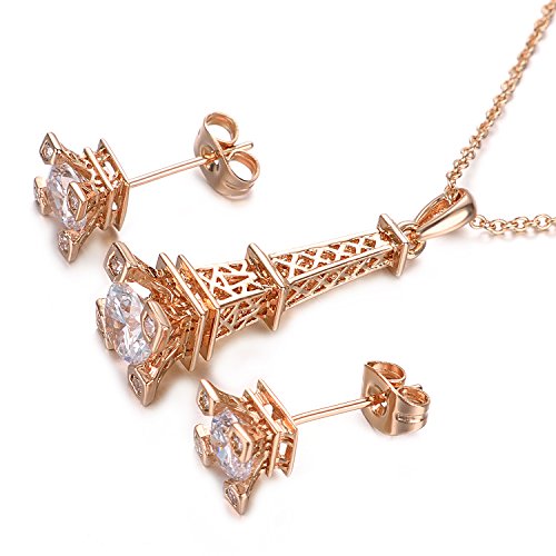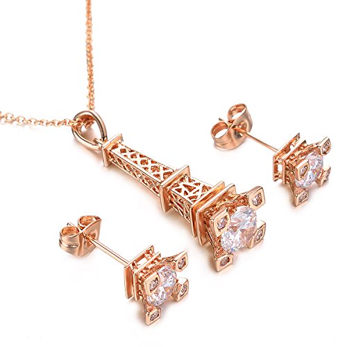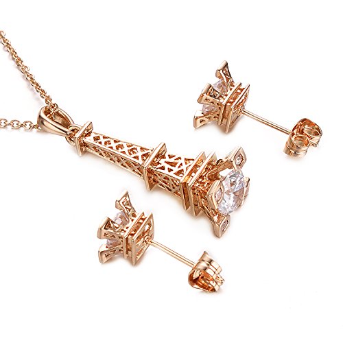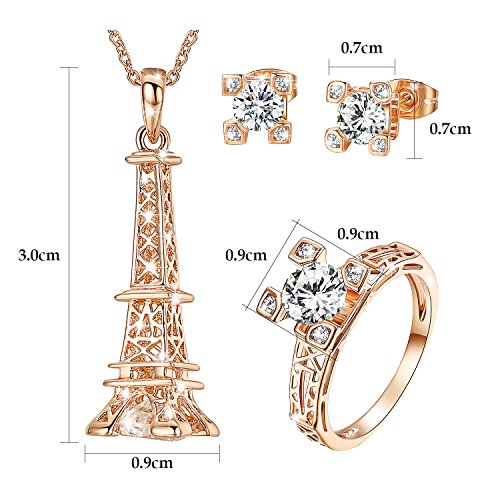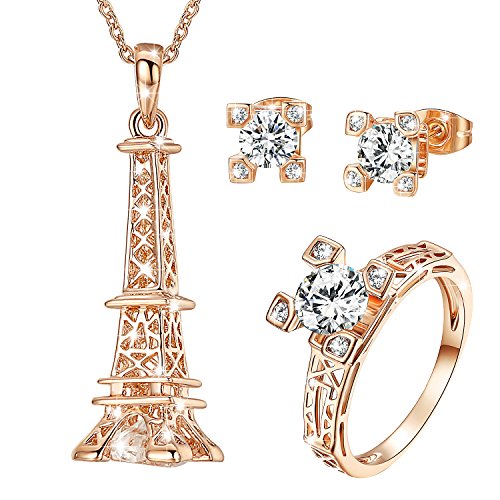 This set consists a necklace,a ring and a pair of stud earrings. Round crafted Cubic Zirconia shinning beautifully and gracefully. The necklace pendant is Eiffel Tower designed.