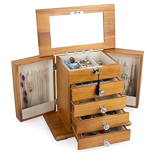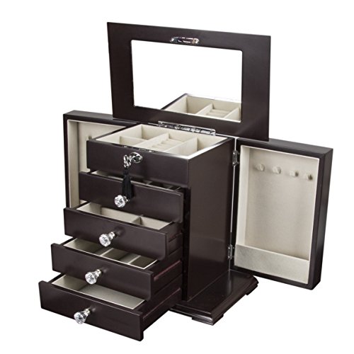 Hand-crafted of the finest sleekest real natural hardwood, innovative in design, delicious tone, this jewelry box features convenient compartments, unique fold out panel design for hanging necklaces and bracelets, gleaming fixtures, and large capacity to hold even the largest jewelry collections, Showcase your collection in glamor and style in this timeless jewelry case. Life with style!Feature
