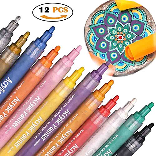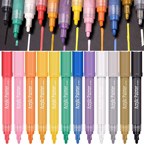 Ewong Acrylic Paint Pen Set - Permanent Art Canvases for Painting-Artist Marker Kit for Rock, Glass Writing, Fabric, Craft Project, Metal, Porcelain, Mug, Wood, Body, 12 Color/Pack Medium Point Tip