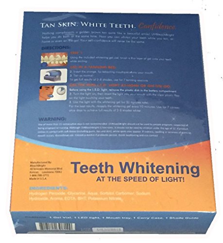 -. Binding : Health and Beauty -. Brand : Bleachbright -. EAN : 0733556280496 -. Feature : Easy to use! Just paint on the gel and tan as normal or use the LED light / Use anytime in tanning beds, with natural sunlight, or with the included at-home light / Powerful yet gentle paint-on solution / Virtually no sensitivity / Enough Solution for 10+ Applications -. IsAdultProduct : 0 -. Label : BleachBright -. LegalDisclaimer : CAUTION: Always check with your dentist before using any teeth whitening products. Avoid contact with eyes. Do not swallow. Use only as directed. -. Manufacturer : BleachBright -. MPN : UVST -. PackageQuantity : 1 -. PartNumber : UVST -. ProductGroup : Health and Beauty -. ProductTypeName : HEALTH_PERSONAL_CARE -. Publisher : BleachBright -. Size : 3.5ml -. Studio : BleachBright -. Title : Bleach Bright Home or Salon Teeth Whitening Kit -. UPC : 733556280496