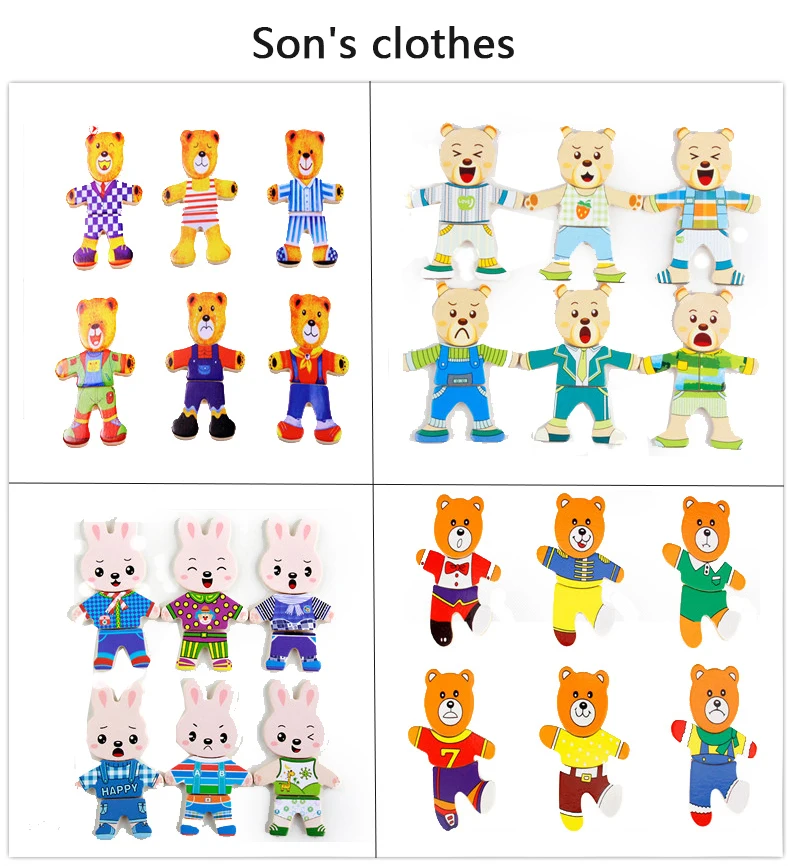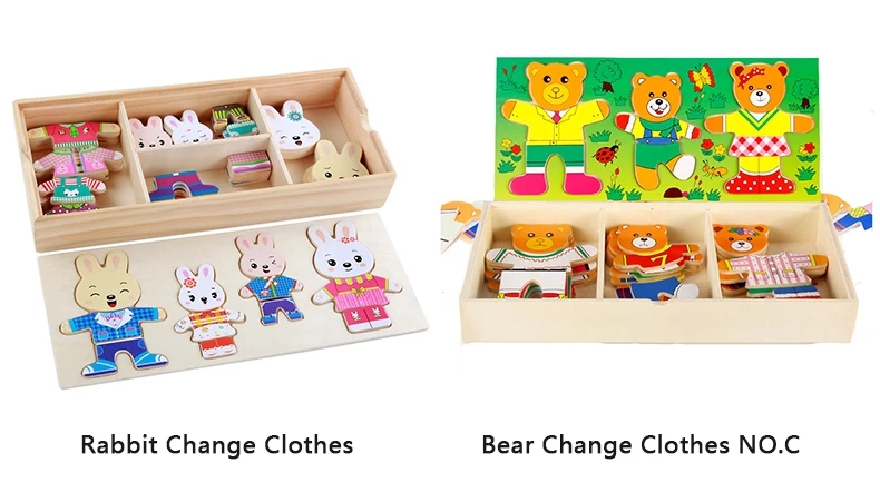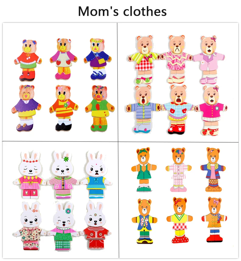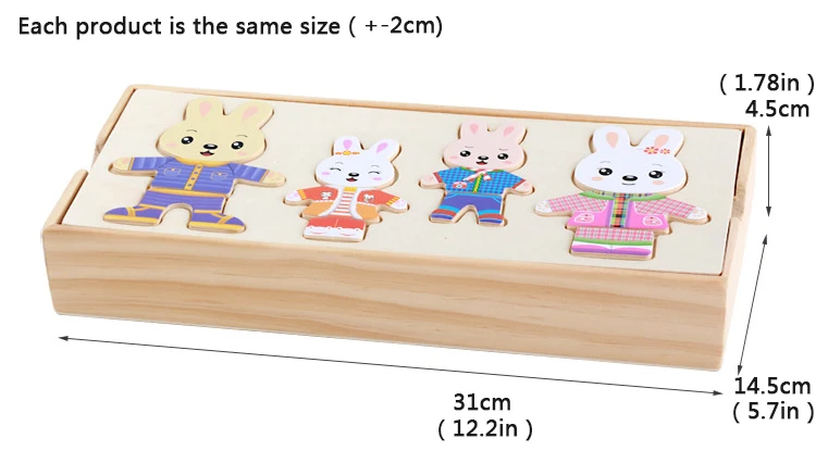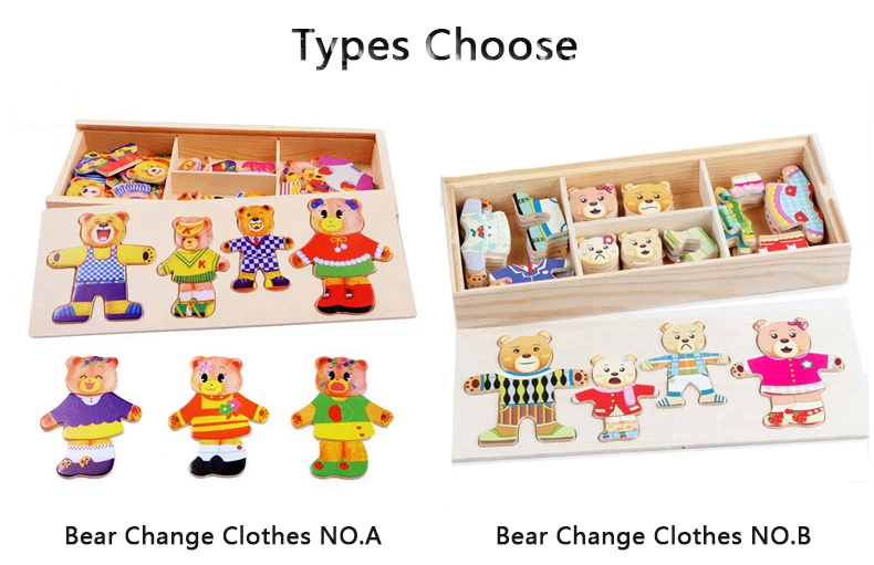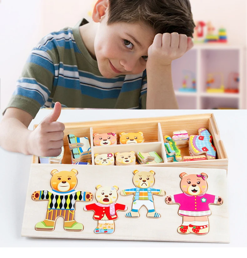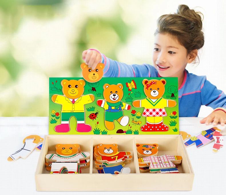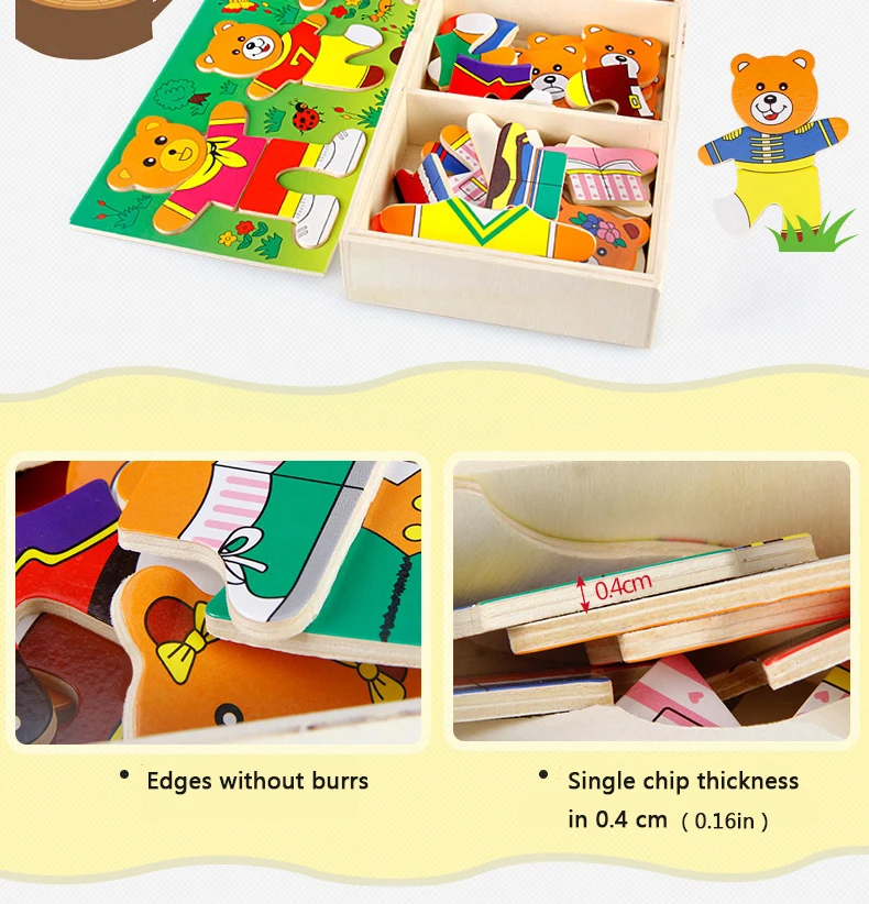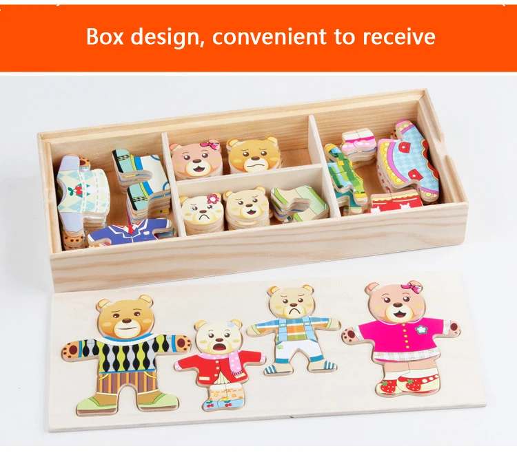 Work exquisite small wooden box cover with a groove, lovely father bear, mother bear, baby bear.Little Bear can let the baby according to fight in the groove of arbitrary collocation clothes, help bear dress up ... Exercise your baby's hand eye coordination and resolving power. After a good play to make-up into the small wooden box, very convenient. It is very popular a toy ~ ~