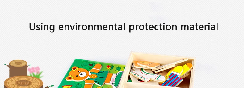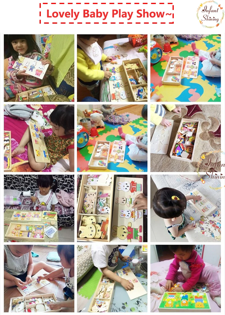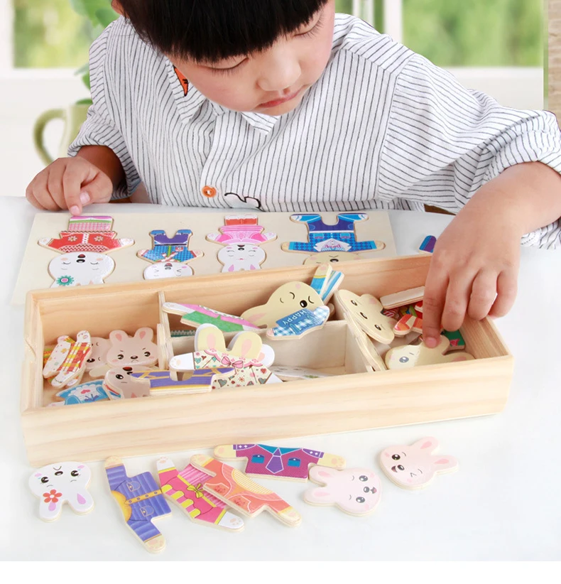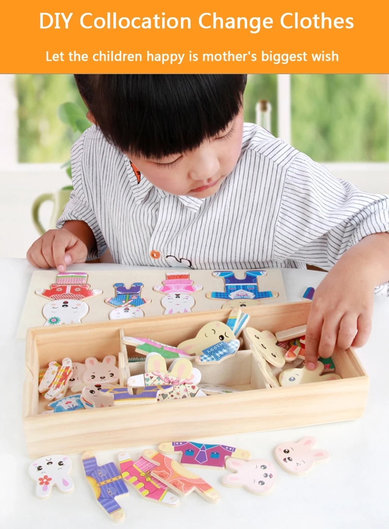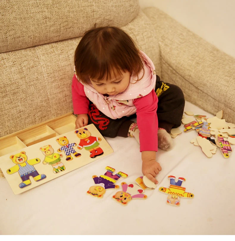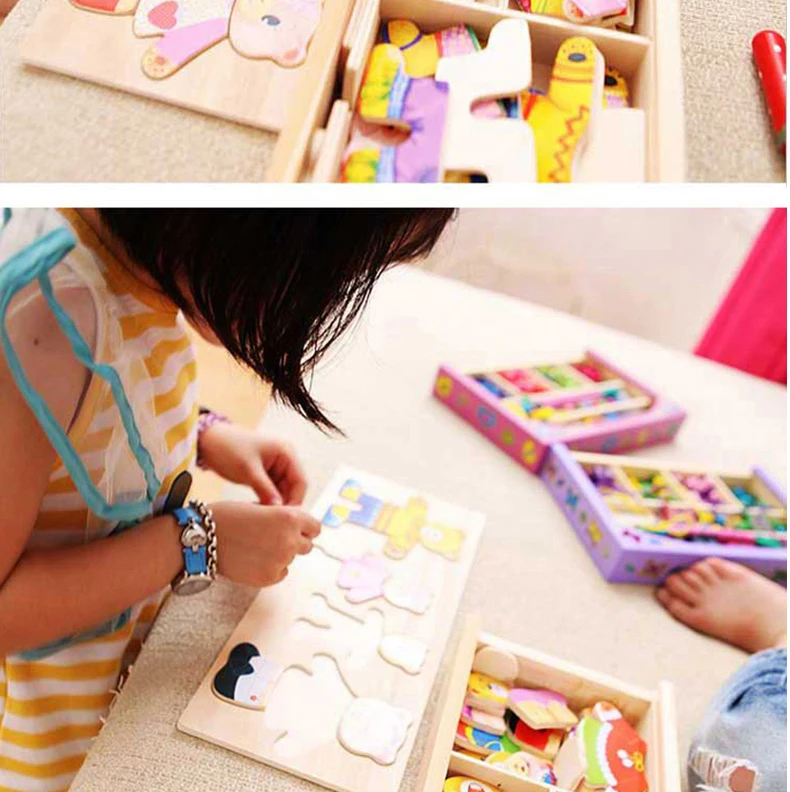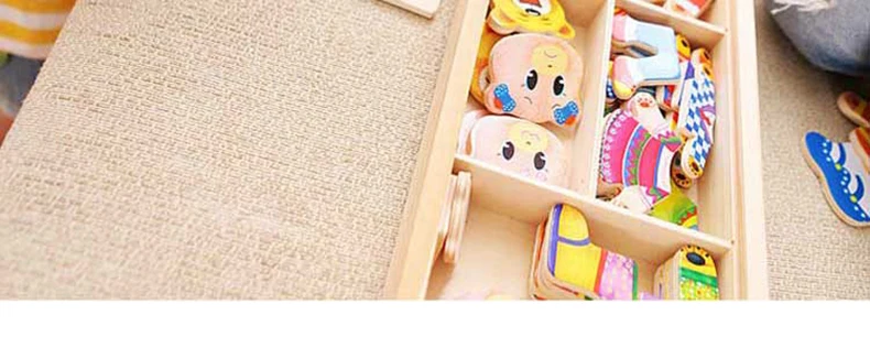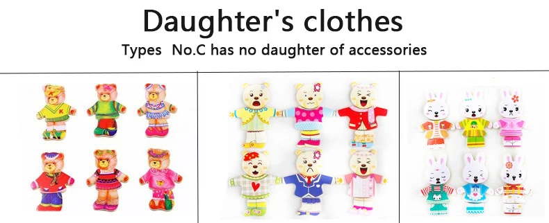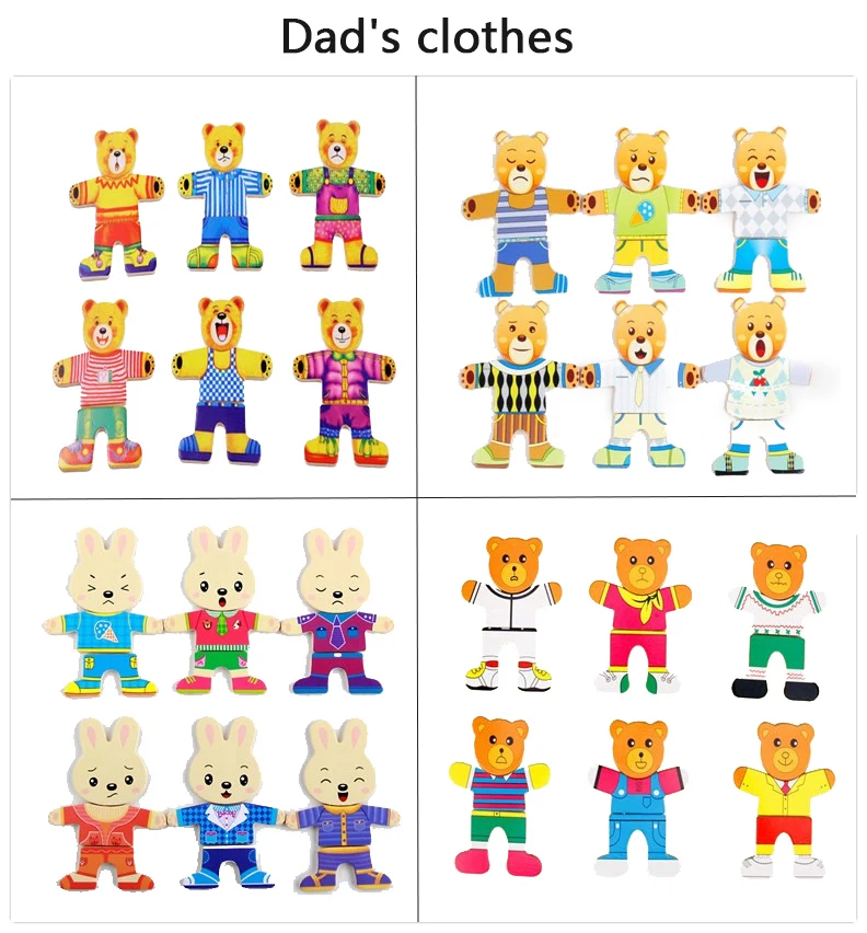 Work exquisite small wooden box cover with a groove, lovely father bear, mother bear, baby bear.Little Bear can let the baby according to fight in the groove of arbitrary collocation clothes, help bear dress up ... Exercise your baby's hand eye coordination and resolving power. After a good play to make-up into the small wooden box, very convenient. It is very popular a toy ~ ~