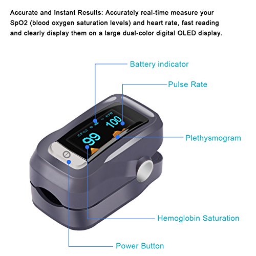 Studio : AOZBZ Publisher : AOZBZ Binding : Health and Beauty Product Description The OLED display can rotate four directions with six different display modes, Accurate and Instant Results. Automatically power off in 8 seconds when there is no signal. Low power indicator. Fit for most finger sizes, light weight, package includes a lanyard and storage pouch, easy to carry. Widely Use:Advanced technology combined with unique convenient features,Intended use for spot check of pulse rates and blood oxygen saturation level at home, in sport and recreational use, such as mountain climbing, high-altitude activities and running. This device is for Sports andamp; Aviation use only and not intended for medical use. Customer satisfaction guaranteed! with 12 months WARRANTY