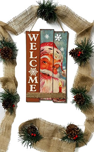 - Festive Welcome sign is a traditional keepsake, with everyone’s favorite, Santa, smiling cheekily out at us. Lightweight wood with a ready-to-hang ribbon and sparkly snowflakes drifting down, this sign is easy update to your Christmas décor.