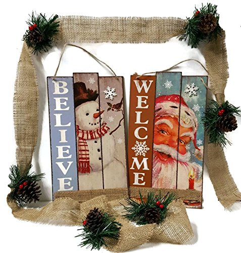 Handcrafted Burlap Garland & 2 Wooden Signs: Santa "Welcome" & Snowman "Believe. 2 Pc Bundle