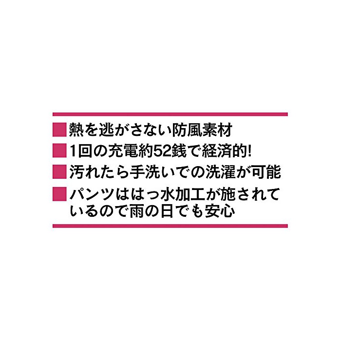 발열 시간:강약3시간/중 약4.5시간/약약7시간※충전 상황이나 지역,기온 등의 사용 환경에 의해 사용 시간은 변동합니다. 부속품:충전식 배터리(1개)고, 충전 어댑터(1개)