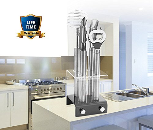 -. Feature : Made of high quality durable stainless steel, polishied stainless steel is smooth and no burr, non-slip and safe for your kitchen. / Each product closely connected, hook design easy to hang, smooth handle without burrs, convenient storage and save space. / Acrylic bracket easy to storage, extra towels are available for you to ensure the health of your kitchen. / Package includes: peeling machine, opener, whisk, from the plate, storage base, towels. / Commitment to 12 months of quality assurance.We will do our best to solve the problem if you are not satisfied with our product.