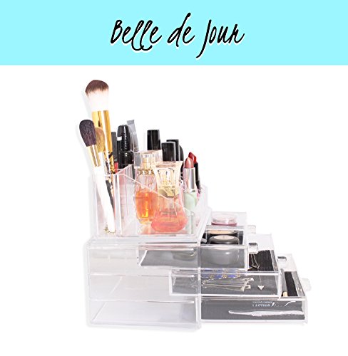 Acrylic Makeup Organizer - Clear Deluxe Case with 4 Drawers - Large Tray and Brush Stand - Perfect for All Types of Cosmetics & Jewelry Including Lipstick, Perfume, Earrings, Rings, Blush - Two Piece Cube Design Great for Countertops