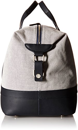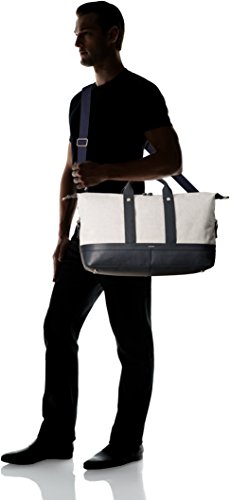 -. Feature : Two-tone duffle bag featuring structured footed bottom and banded top handles / Exterior details: 1 hidden zip pocket behind strap; interior details: 1 zip pocket, 2 large slip pockets, and 1 small slip pocket / Measurements: 19.69 inch l x 9.06 inch w x 10.24 inch h / Handles/strap: 2 leather grab handles and 1 adjustable webbing shoulder strap / Zipper closure / 4.13 grab drop, 27.56 inch shoulder drop