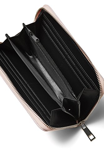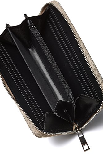 LARGE CAPACITY AND MANY COMPARTMENTS. The faux suede pouch measures 7.5 x 4 x 1 inch and fits large smartphones including iPhone 7 Plus. Its interior features ? 2 full length bill slots to store flat bills; ? 3 full length open compartments roomy enough for your passport, cell phone, folded cash; ? 8 credit card slots to keep your ID card, driving license, debit and credit cards; ? center zip pocket for coins.
