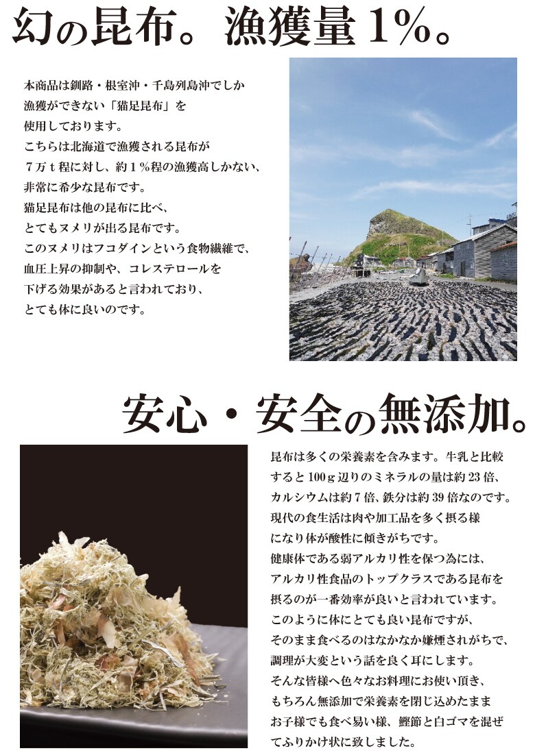 ・原材料/材質/素材:ねこ足昆布、かつお節、白ゴマ、醸造酢