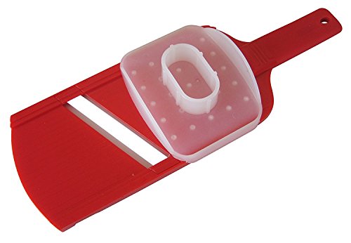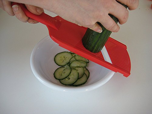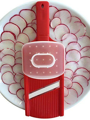 Hand-Held Mandoline Slicer. Ultra Thin Cucumber Potato Apple & Food Cutter. Small BPA free Mandolin Fits any Kitchen. Dishwasher Safe. Ceramic Blades Cut Vegetables like Professional. Hand Guard. Red