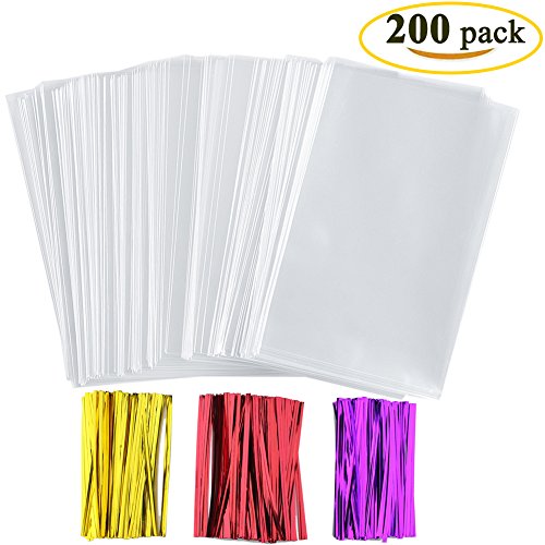 Specifications: Bag size: 6 x 9 inches 1.4 mils thickness Bag color: clear Bag material: opp Twist tie length: 4 inches/ 10 cm Twist ties colors: gold, silver, red, green, blue, purple Package includes: 200 x Cello bags 200 x Twist ties 0