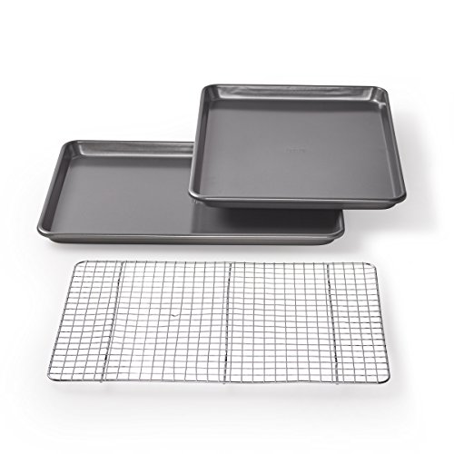 - Non-stick 3-piece set includes (2) cookie/jelly roll pans and 1 cooling rack pans measure 16 by 12 by 2-Inch, rack measures 16-1/2 by 11-1/2-Inch; half sheet pan
