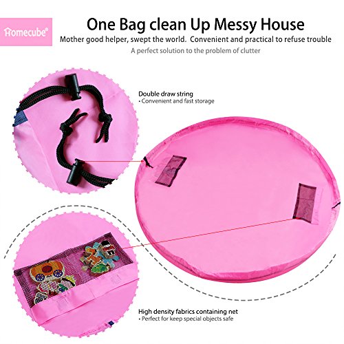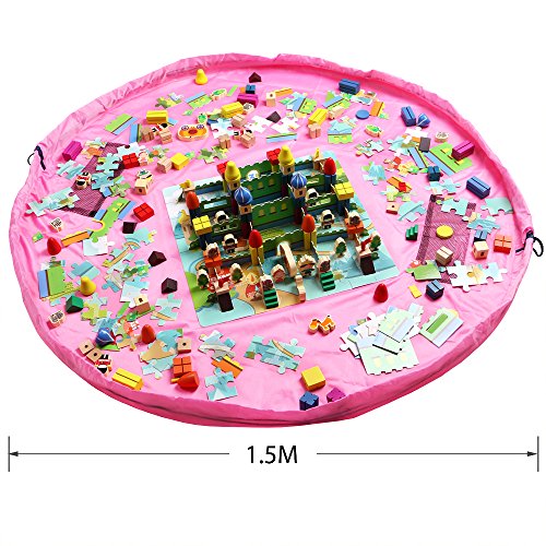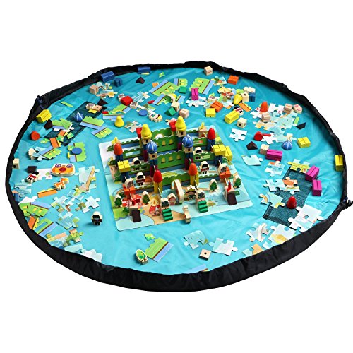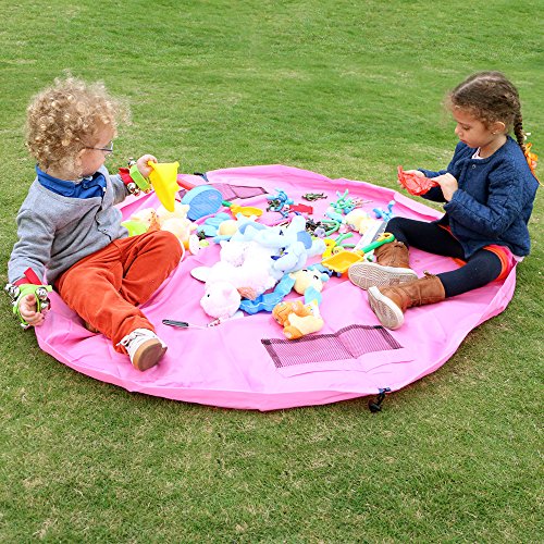 遊ぶときは広げてプレイマットとして大活躍。 ヒモを引っ張るだけでお片づけ! おもちゃ遊びスペースが一気に収納袋に。