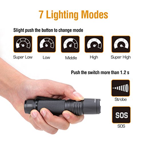 - 7 Modes: Regular 5 adaptable settings: Super Low/ Low / Medium / High / Super High; 2 Stealth Modes: Strobe / SOS.