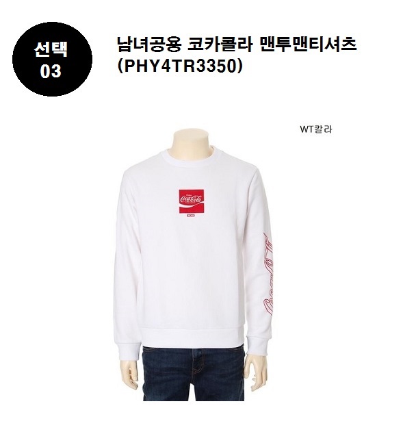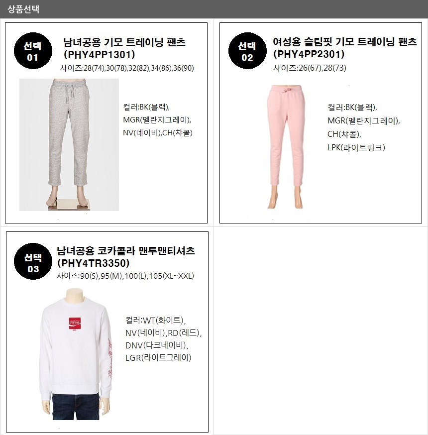 - 선택01_남녀공용 기모 트레이닝 팬츠입니다. 선택02_여성용 슬림핏 기모 트레이닝 팬츠입니다. 선택03_남녀공용 코카콜라 콜라보 맨투맨티셔츠입니다. | |