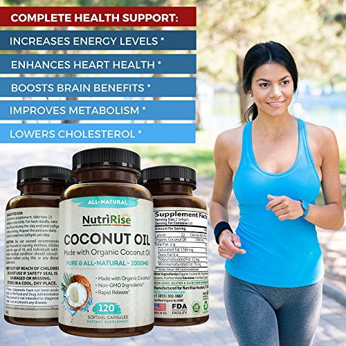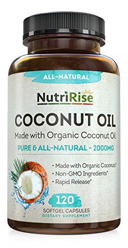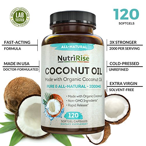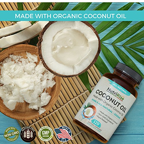 *100% SATISFACTION GUARANTEE: Feel healthier or your money back!* +100% PURE, NON-GMO & ALL NATURAL FORMULA: All Natural Coconut Oil Capsules WITHOUT corn starch, sorbitol, fillers, binders, artificial ingredients, stearates, gluten, gelatin, soy or corn. Naturally derived from pure coconut oil (cold pressed coconut oil). Unlike fractionated coconut oil, NutriRise Coconut Oil capsules are a rich source of MCTs, MCFAs and Lauric Acid. +PROUDLY MADE IN USA: Our Coconut Oil is proudly manufactured in a FDA-Registered and GMP Compliant Facility in USA. +POWERFUL HEALTH BENEFITS: Numerous clinical studies prove the POWERFUL benefits of NutriRise Coconut Oil Softgels: - Promotes Cardiovascular Health - Promotes Beautiful Skin, Hair & Nails - Increases Absorption of Vitamins - Improves Metabolism - Strengthens Immune System - Increases Energy Levels - Balances Healthy Cholesterol - Boosts Brain Function - Rich Source of MCT, MCFAs and Lauric Acid +DOCTOR-FORMULATED: NutriRise Coconut Oil is formulated by doctors to contain 2000mg coconut oil per serving for HIGHEST absorption and rapid release. +THIRD PARTY TESTED: Each and every batch of our Coconut Oil pills are third-party tested for highest purity & quality assurance. + NutriRise Coconut Oil Supplement contains the highest quality of coconut oil for hair health, coconut oil for skin & superior beauty benefits! Click the "Add to Cart" Button to achieve these benefits now!Feature