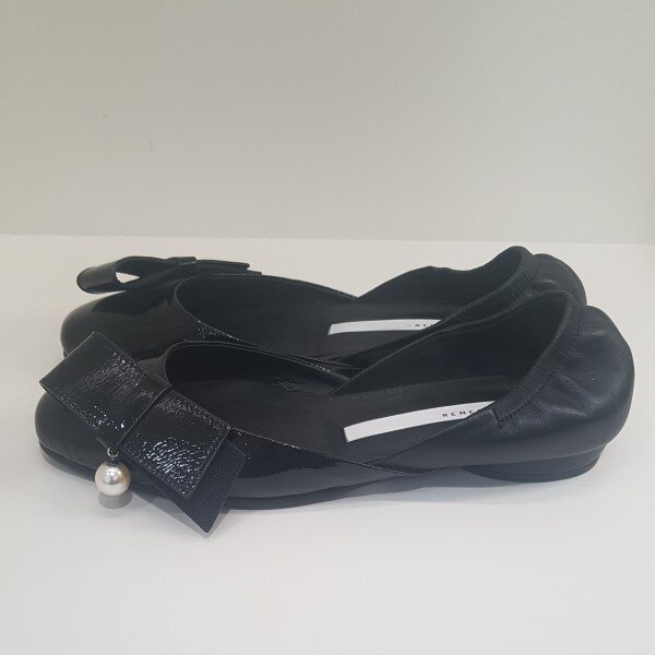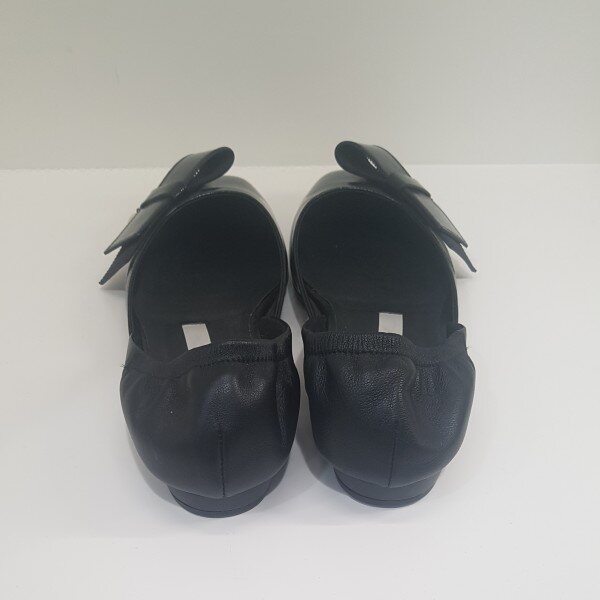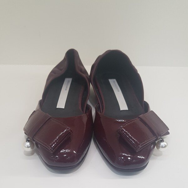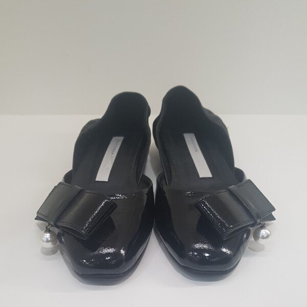 리본장식이 있는 애나멜 플랫슈즈.발등쪽 이밴드 고무줄 있음.