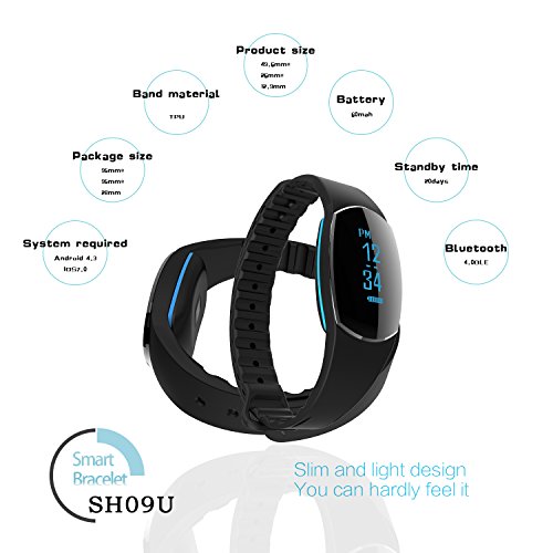 Track your daily activities every day with this smart and compact watch. Search and download "Smart Movement" from your APP store, the APP supports Bluetooth 4.0 or above, support Android 4.3 or above, IOS 7.0 above. Key Features: Fitness Tracker: Record distance, steps in your daily life, calorie burned analysis and active minutes. Monitor Your Health Everyday: Real-time heart rate monitor when you wake up in the morning, before sleep or finish your run, dynamic blood pressure monitor and sleep quality monitor, help you better understand your health. Never Miss Any Important Information: Vibration tracker with OLED display will let you know incoming call, SMS message and SNS message from APP like Facebook, Twitter and Instagram, answer your call and reply any message timely. IP67 Waterproof: No worry about sweat, wet, rain and splash, you can also wear it when cooking and shower. Remote Camera Control:Remote control photograph shooting by operate the OLED touch screen. Smart Alarm: Set silent alarms on the tracker to remind you some important things, or wake you up without disturbing others. Specifications: Model: SH09U Bluetooth Version: 4.0 Screen: OLED Touch Screen Compatible System: IOS 7.0 Android 4.3 above Charging Time: 2 hours Working Time: 4-6 days Stand By Time: 10 Days Product Weight: 0.04lb Band Material: TPU Charging Port: USB charge Battery Capacity: 60mAh Package: 1 x SH09U Smart Watch, 1 x Use Manual 100% Satisfaction: All purchase have 2 years warranty, as well as technical support customer support, if you have any problem, please contact us for troubleshooting. 0
