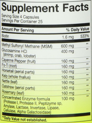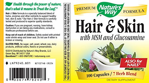 ReleaseDate : 2012-04-17 Studio : Nature's Way Publisher : Nature's Way Binding : Health and Beauty Product Description Hair and Skin provides nutrients necessary for healthy hair, skin and nails. It includes effective doses of MSM (MethylSulfonylMethane), a sulphur source that provides necessary nutrients for the building process of proteins in Hair and Skin. Glucosamine, which aids in collagen and connective tissue formation. Concentrated Enzymes, that help with the proper break down of food allowing delivery of sufficient nutrients to the extremities. Biotin, essential ingredient for formation of hair, skin and nails, and a blend of other traditional herbs. 0