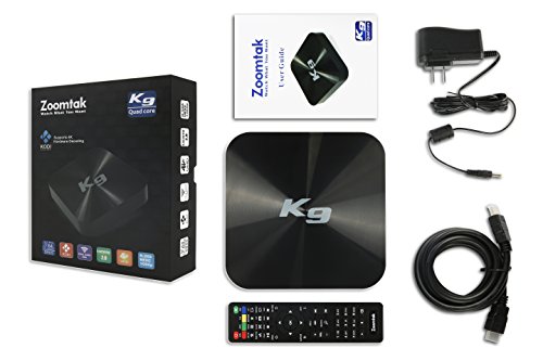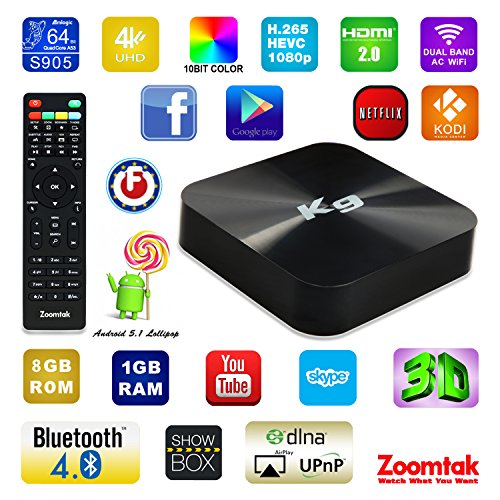 -. Feature : Zoomtak K9--a Streaming Media Player with Android 5.1 Lollipop OS,Powered by Amlogic S905 Quad Core Cortex A53 Up to 2.0GHz Chipset.Penta-Core Mali-450 3D GPU Graphics Processor.configure with 1GB RAM,8GB eMMC, 802.11 a/b/g/n/ac 2.4g/5.8g dual band AC wifi,Bluetooth 4.0 ,Zoomtak NEW unique Housing.Support 4K Streaming Movies By HDMI 2.0. KODI 16.1,Facebook,Youtube,Netflix,Google Play Store be preinstalled for your customized HD viewing experience / TRANSFORM YOUR TV INTO A SMART TV INSTANTLY with Zoomtak K9--Enjoy Unlimited Movies, TV Shows, Music, Sports and more with No Contracts and No Monthly Fees! Say goodbye to high cable bills and put your money back into your pocket, Watch Everything what you want.Browse the web,Play games,Skype video chat with friends and family on social media across the world.Install millions of apps from Google Play Store and Zoomtak APP Store.All demands at your fingertips. / HOW TO SETTING? SO EASY!!!-- Plug-in power,HDMI or RCA ,Ethernet Cable>>>Follow the wizard to setup the language,screen size and connneting internet(WIFI or Ethernet)>>>From home page select APPS>MEDIA MANAGER>select KODI Addon install>click OK(DO NOT EXIT THIS PROCESS ONCE IT HAS STARTED TO DOWNLOAD)>>>go back to home page and select KODI media center>>>Enjoy Unlimited Movies, TV Shows, Music, Sport with Fully Loaded KODI. All you need is a High Speed internet connection and an HD TV. / ZOOMTAK MEDIA MANAGER APP--This is a unique app only work on Zoomtak android tv box to ensures that you have the latest and greatest WORKING add-ons in KODI at anytime,We will Update the addons from server in usa,when we find great addons,and also delete the no working addons by Media Manager timelessly.what you only need to do is that enter MEDIA MANAGER and One click updater button then your KODI is operating like all new!!So our KODI is Fully Loaded with latest and greatest at any time. / SMALL BOX, AMAZING ENERGY--Zoomtak P.R.Ivate Unique Metal Casing with Low noise and low heat for long life expectancy,Watch your 4K streams in the most stunning visual quality! Imagine sitting down, turning on your television and watching any movie, TV show or sporting event on demand without paying a dollar for it.That's exactly what you will get with the Zoomtak K9 Android TV Box! Make this dream a reality today!