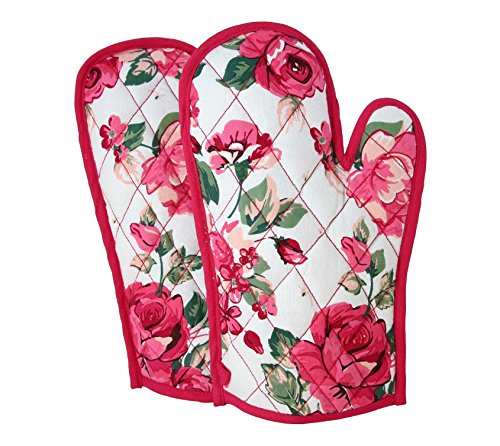 Shalinindia Cotton Oven Mitts Printed Set of 2 Quilted Cooking Gloves,OG02-1428,Pink,8 x12 Inch