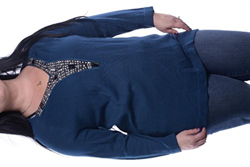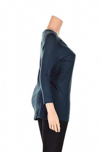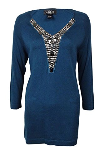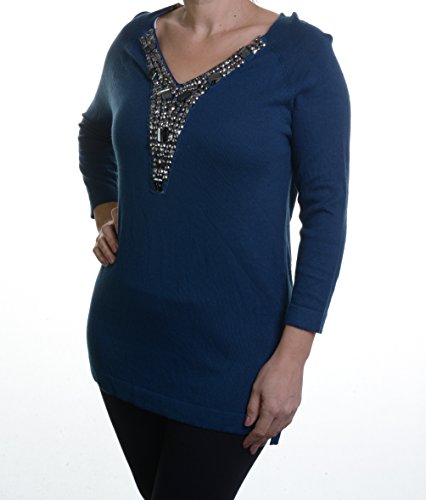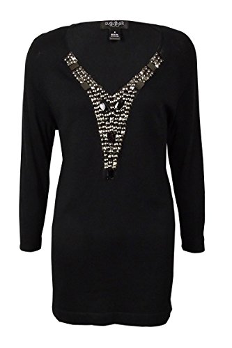 Product DescriptionSweater features knit fabric, 3/4 sleeves, beaded V-neck and pull over style.0