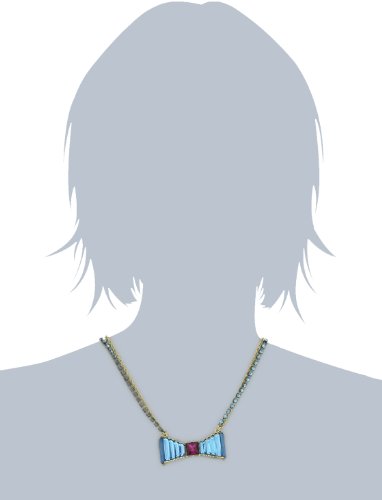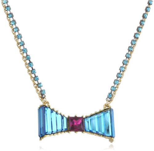 Gold and hematite tone necklace chains with blue colored crystal cup chain accent, blue colored crystal bow pendant with fuchsia colored crystal accent at center