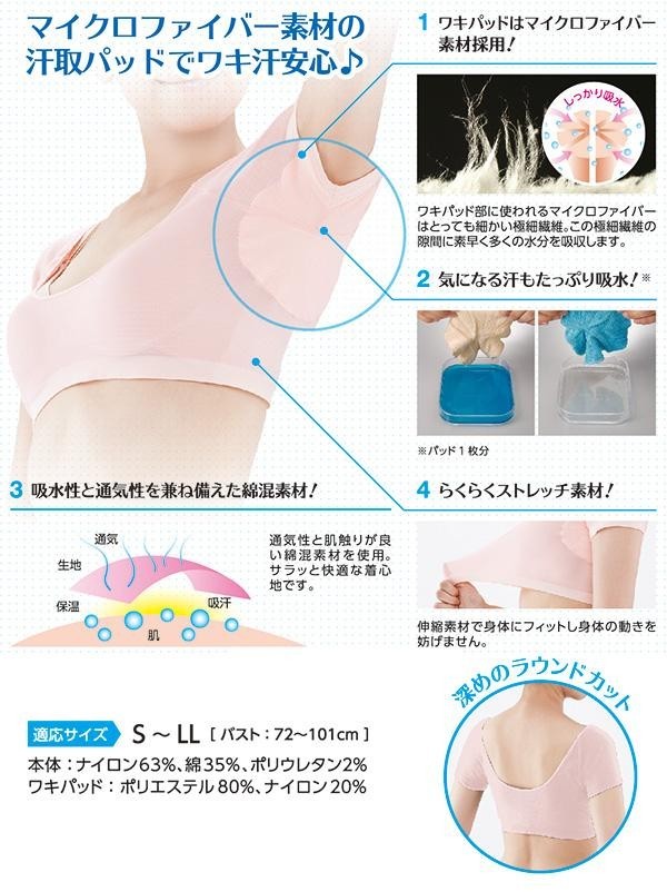 イヤ~な汗ジミをしっかりガードする極薄汗取りインナー。最も気になるワキ部分は吸水性に優れたマイクロファイバー素材を使用!とめどなく湧き出るワキ汗を、マイクロファイバーワキパッドがしっかり吸水。汗ジミも気になりません。身生地も綿混素材採用でサラッとした着心地。アウターにも響きません! |