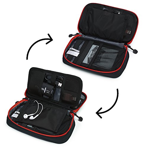 17 different length elastic loops for storing cables and earphones / 10 different size mesh pouches with elastic loops hold charger or USB / 1 outer and 1 inner large zipper pockets for phone or money