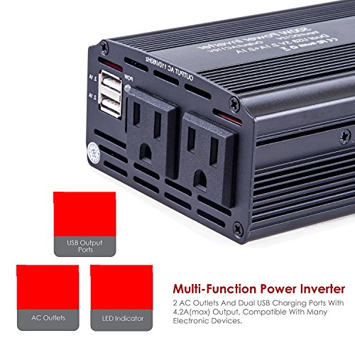 - Premium 500W Power Inverter with 2 USB ports and 2 AC outlets. Dual USB ports can charge most phones and tablets simultaneously (Max 4.2A total output), while two grounded AC outlets (500-550W each) provide up to 1000W for larger devices