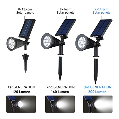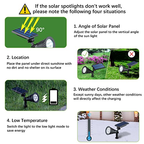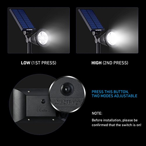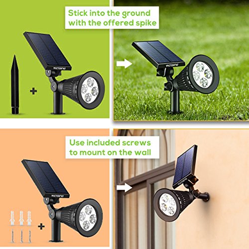 VicTsing upgraded 2-in-1 solar led Spotlight automatically illuminates at dark and shuts off in daylight when you have it switched on, which is perfect for patios, decks, pathways, stairways, driveways, garden, etc.