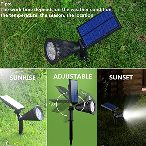 Adjustable Light & Solar Panel. This solar landscape light allows to adjust light angle (90 degree) to get perfect illumination and adjust solar panel (180 degree) to place it in well-lit location