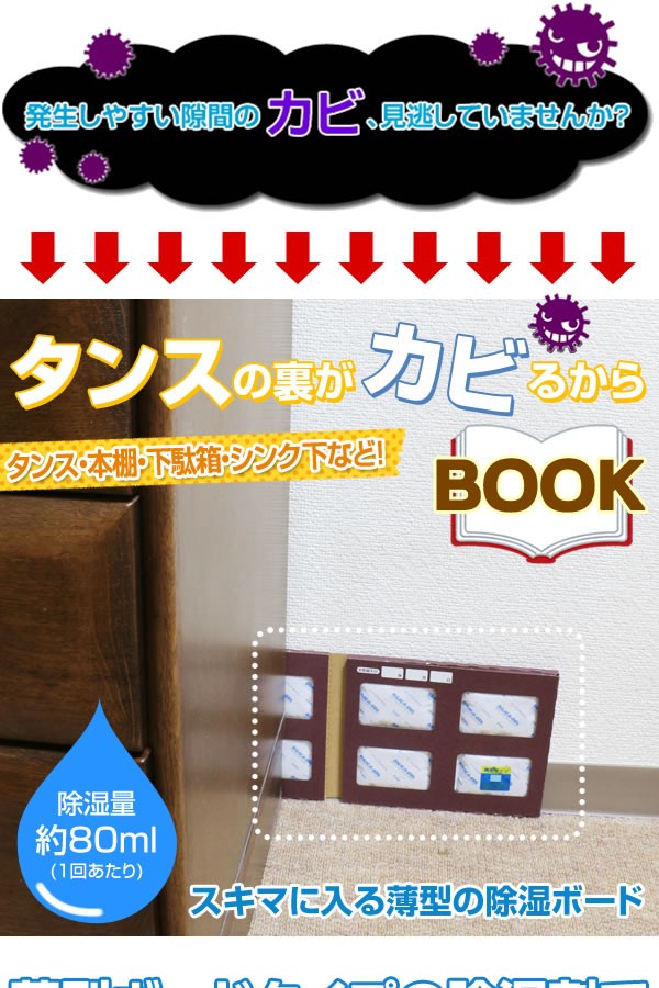 <h1>隙間に入る薄型除湿剤。タンスの裏やシンク下はもちろん、BOOK型なので下駄箱などの角に立てて入れたり、切り離して両隅に設置して効果的に除湿!タンス/裏/隙間/カビ/湿気/除湿/下駄箱/クローゼット/吸湿/場所をとらない/薄い/壁/</h1>