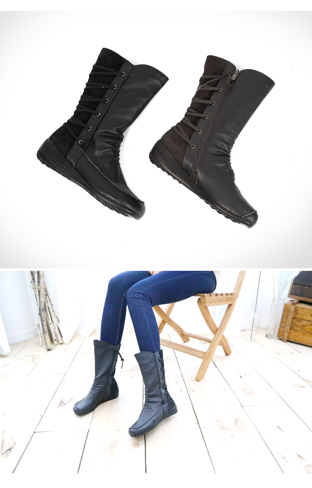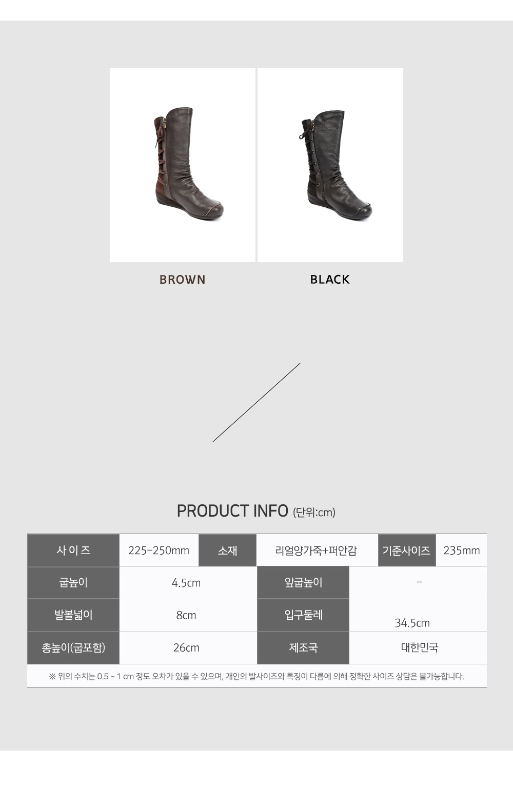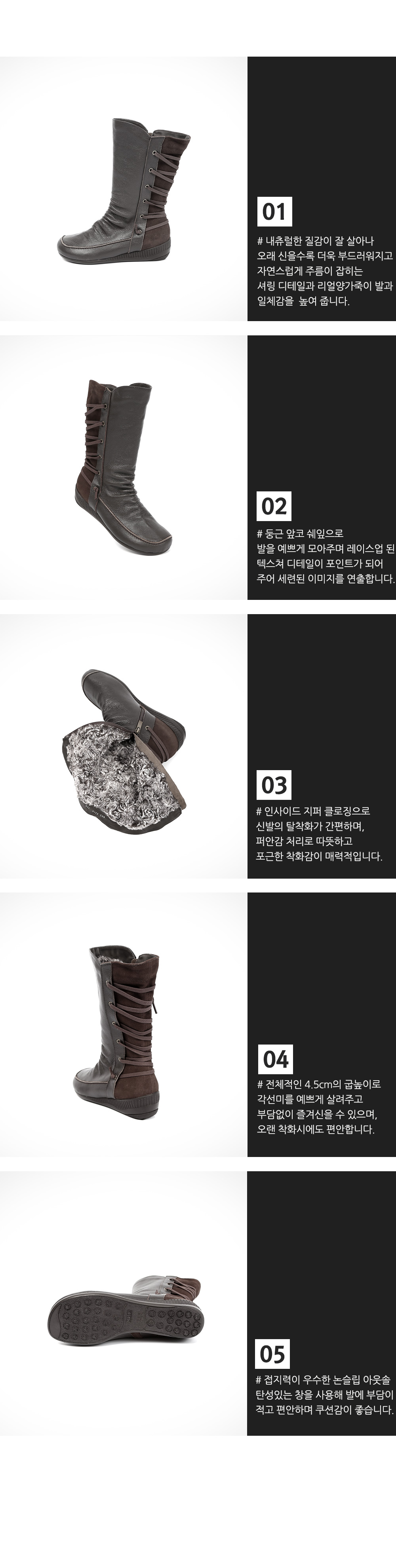 활용도 만점의 데일리아이템 소개합니다. 시크한 매력이 돋보이는 활용도 높은 리얼양가죽 하프부츠입니다. 바디 전체에 굉장히 부드러운 텍스터가 아주 매력적인 제품이죠. 리얼 양가죽과 퍼안감의 디테일이 높은 퀄리티임을 증명해줍니다. 국내 수작업공정으로 꼼꼼히 작업하여 백화점 퀄리티와 동일함을 자부할수 있습니다. 발목으로 이어지는 셔링 디테일이 자연스러운 흐름을 연결해주어 신발만 착용하여도 스타일링이 가능할 정도로 느낌이 잘 연출됩니다.