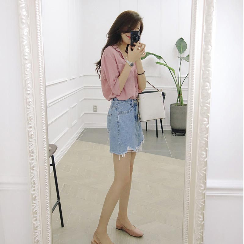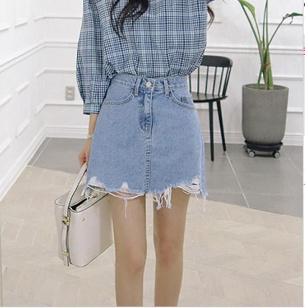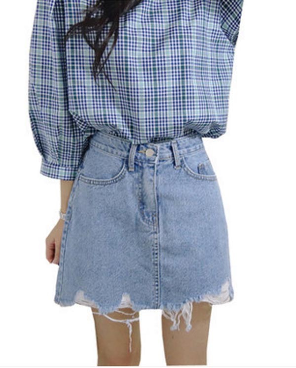 シンプルな前ボタンのデニムスカートの裾をダメージ加工したデザイン!