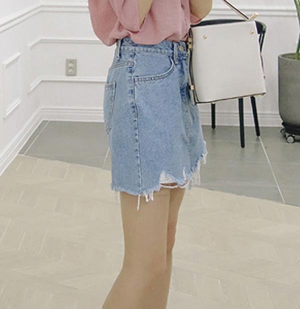 ソフトなデニム生地のライトブルー・ダメージ加工のミニスカートです♪