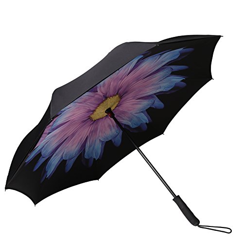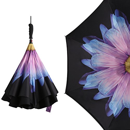 Bagail Double Layer Inverted Umbrellas Reverse Folding Umbrella Windproof UV Protection Big Straight Umbrella for Car Rain Outdoor With Straight Handle Purple Daisy