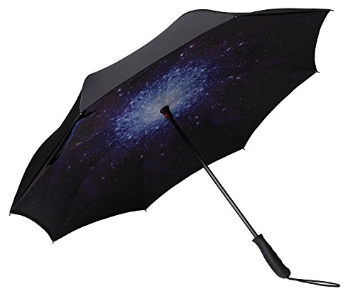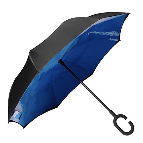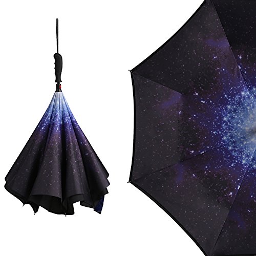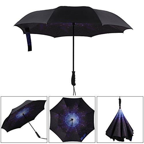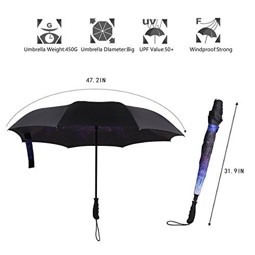 Bagail Double Layer Inverted Umbrellas Reverse Folding Umbrella Windproof UV Protection Big Straight Umbrella for Car Rain Outdoor With Straight Handle Starry Sky