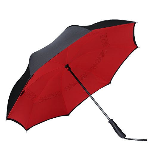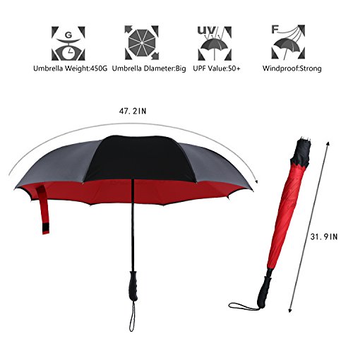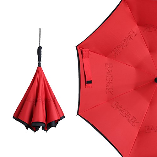 Bagail Double Layer Inverted Umbrellas Reverse Folding Umbrella Windproof UV Protection Big Straight Umbrella for Car Rain Outdoor With Straight Handle Red
