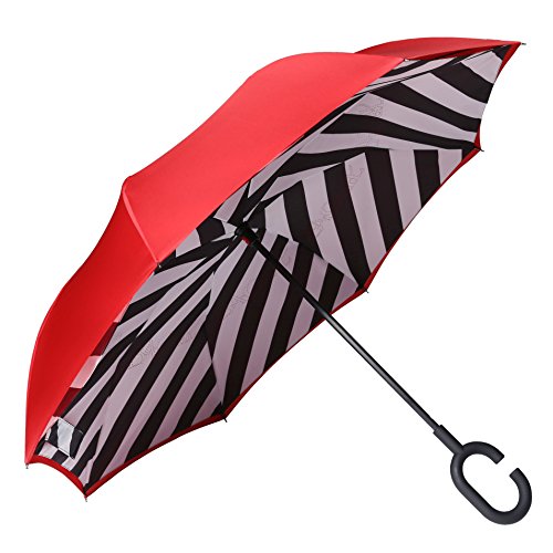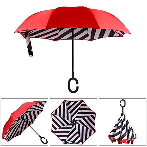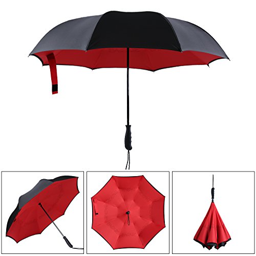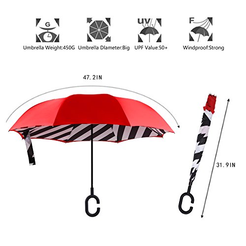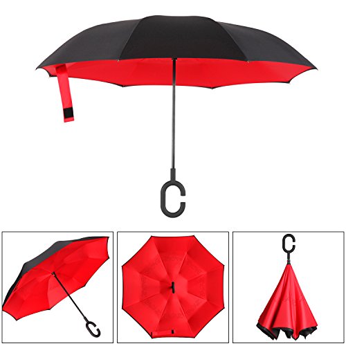 Bagail Double Layer Inverted Umbrellas Reverse Folding Umbrella Windproof UV Protection Big Straight Umbrella for Car Rain Outdoor With C-Shaped Handle Red