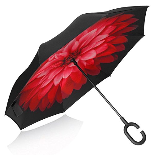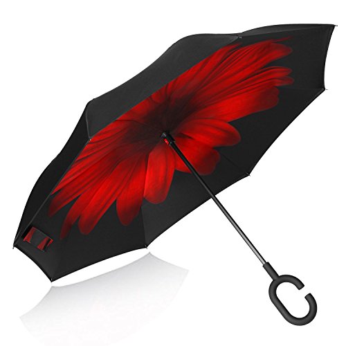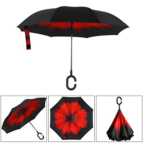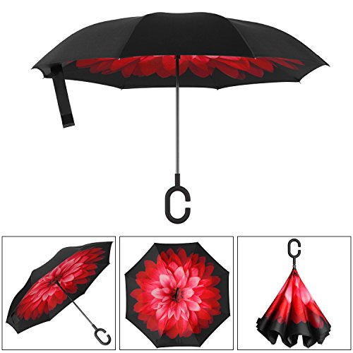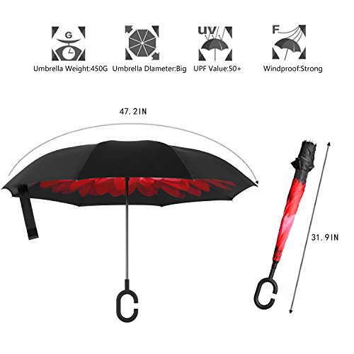 Bagail Double Layer Inverted Umbrellas Reverse Folding Umbrella Windproof UV Protection Big Straight Umbrella for Car Rain Outdoor With C-Shaped Handle Red Flower