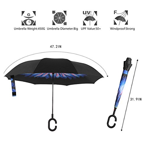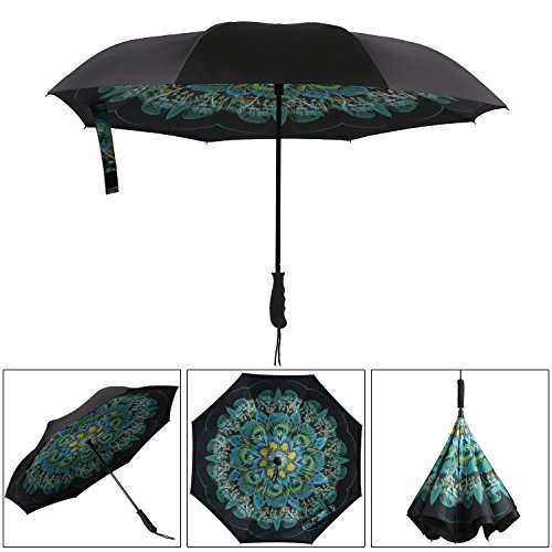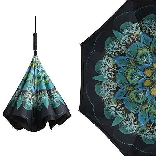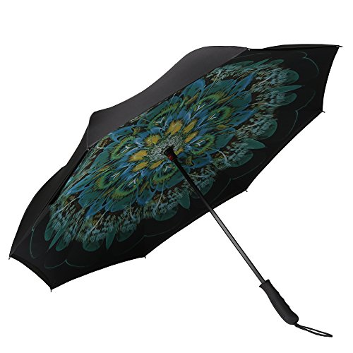 Bagail Double Layer Inverted Umbrellas Reverse Folding Umbrella Windproof UV Protection Big Straight Umbrella for Car Rain Outdoor With Straight Handle Peacock