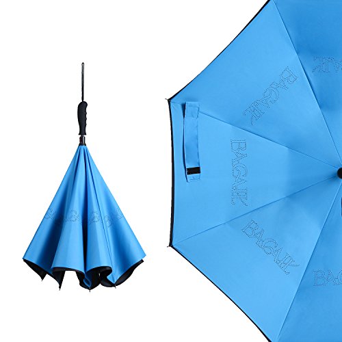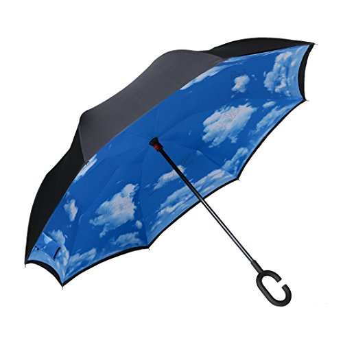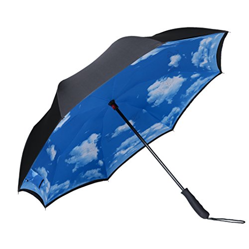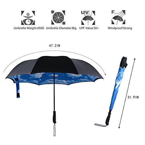 Bagail Double Layer Inverted Umbrellas Reverse Folding Umbrella Windproof UV Protection Big Straight Umbrella for Car Rain Outdoor With Straight Handle (Sky)