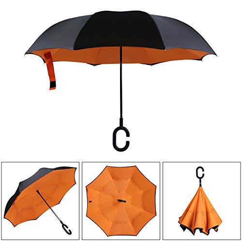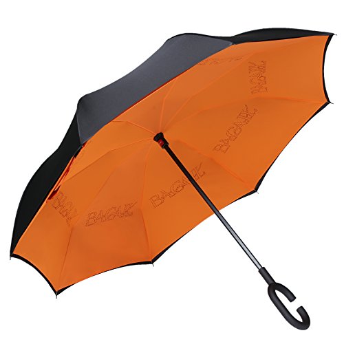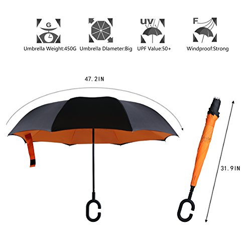 Bagail Double Layer Inverted Umbrellas Reverse Folding Umbrella Windproof UV Protection Big Straight Umbrella for Car Rain Outdoor With C-Shaped Handle Orange
