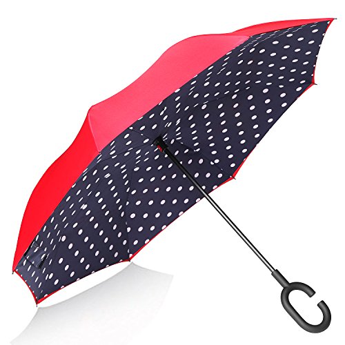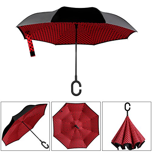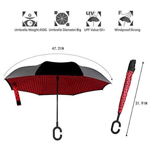 Bagail Double Layer Inverted Umbrellas Reverse Folding Umbrella Windproof UV Protection Big Straight Umbrella for Car Rain Outdoor With C-Shaped Handle Red Dot