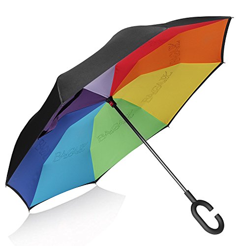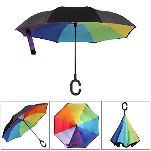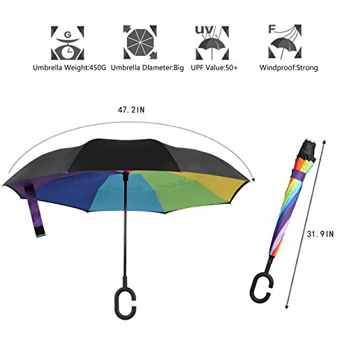Bagail Double Layer Inverted Umbrellas Reverse Folding Umbrella Windproof UV Protection Big Straight Umbrella for Car Rain Outdoor With C-Shaped Handle Rain Bow